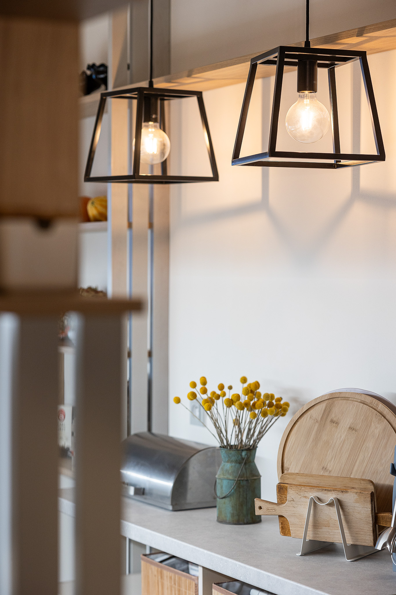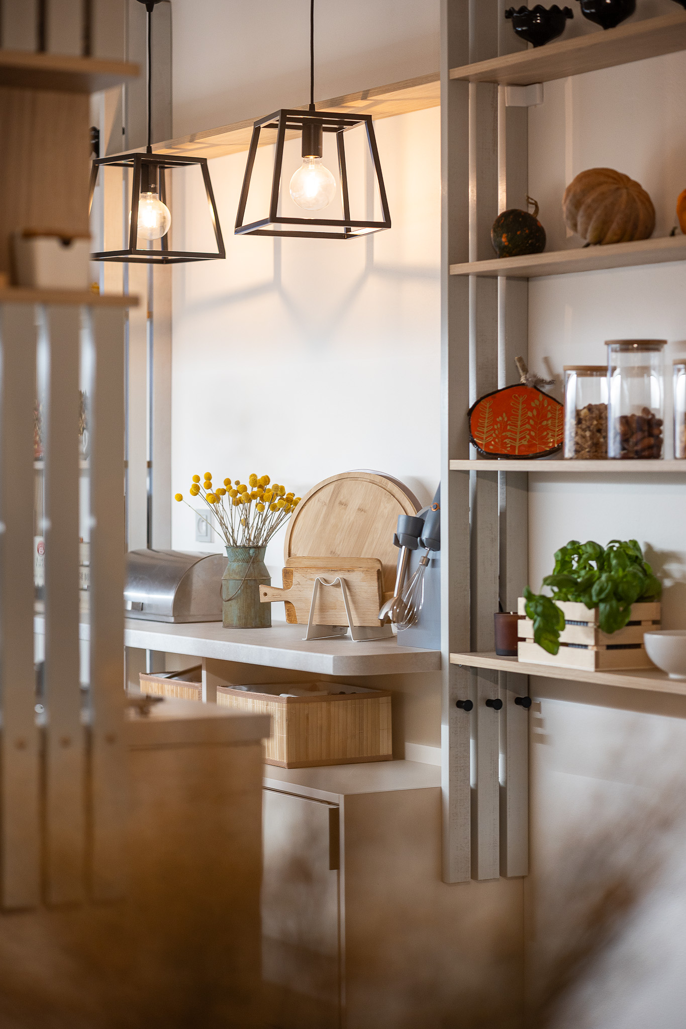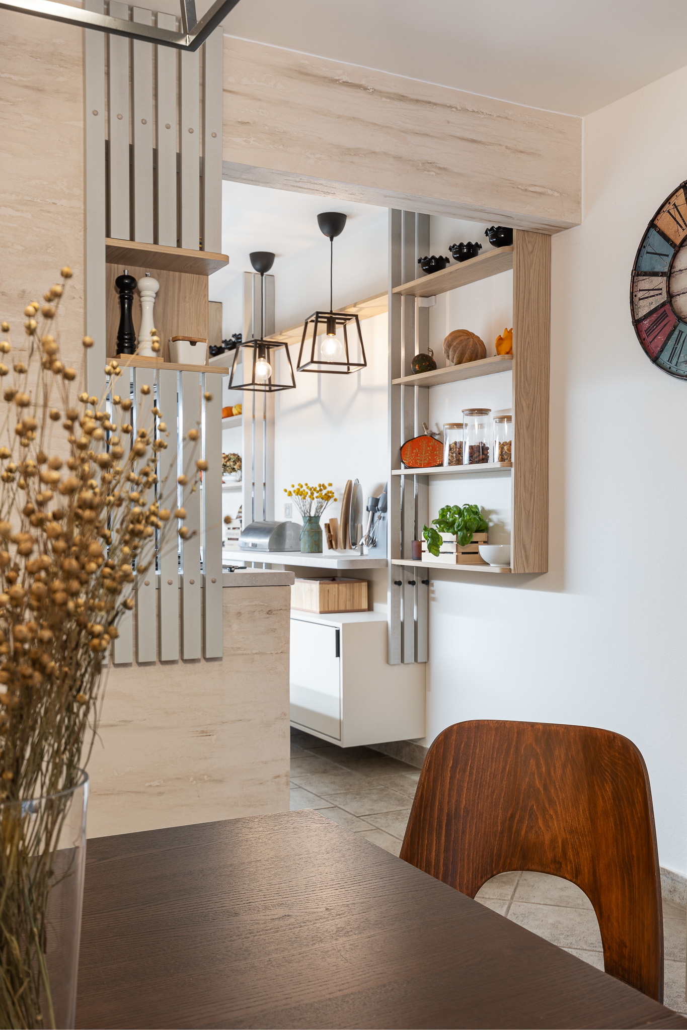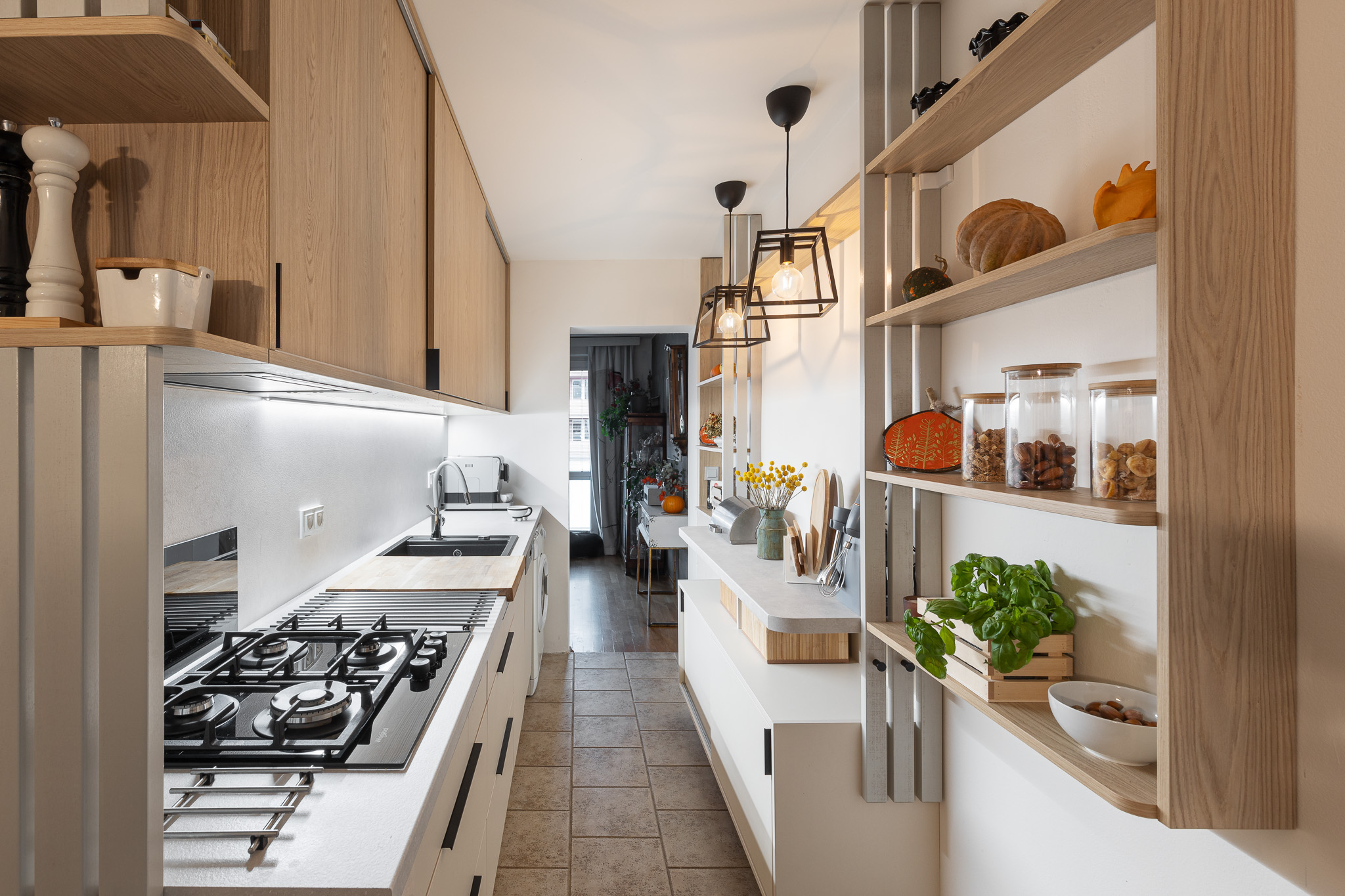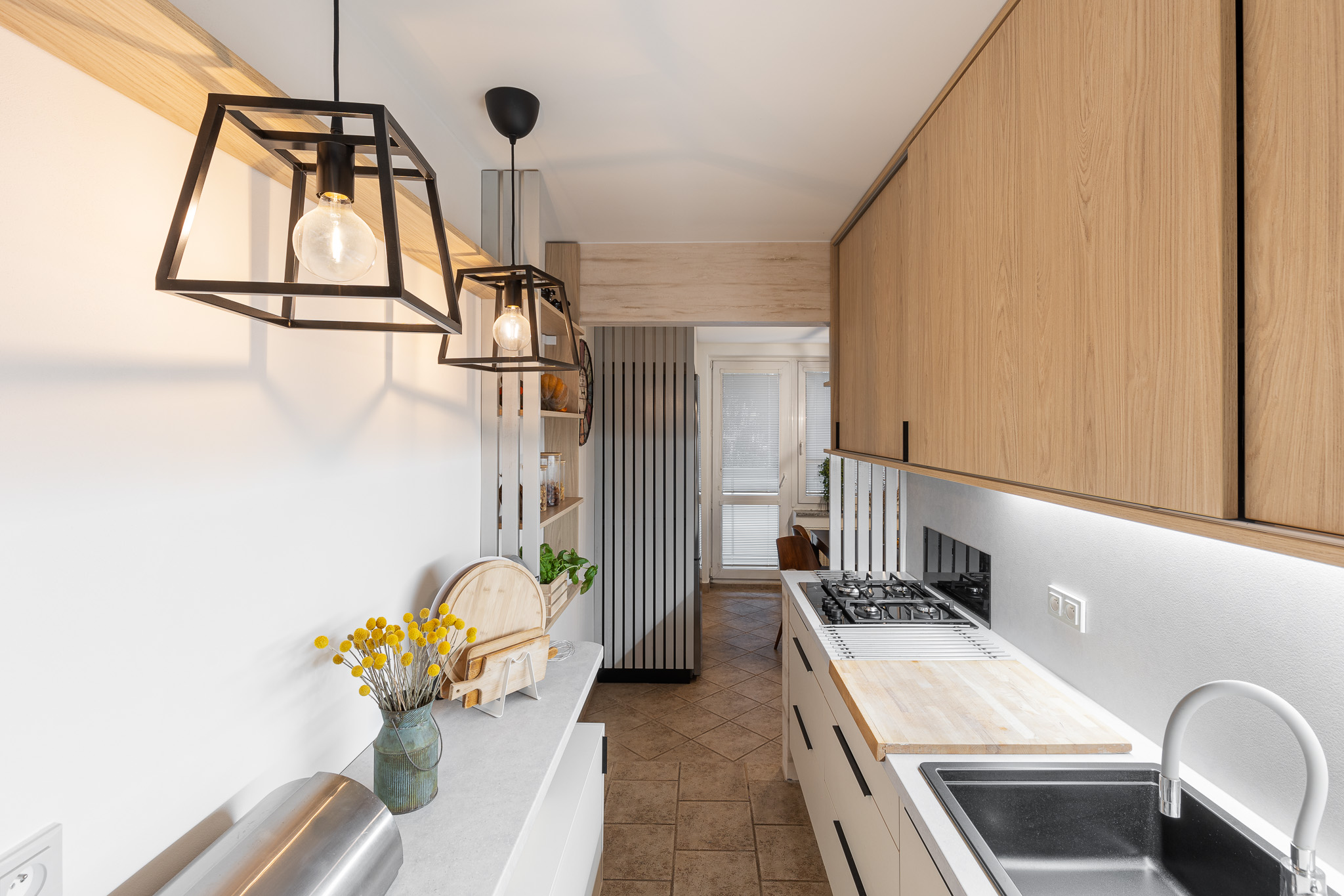 Rozmístění spotřebičů jsme nechali ve stávající pozici, až na troubu, která má nově místo ve vysokém bloku v jídelně. Ten se oproti původnímu stavu rozšířil o jednu skříň určenou pro obě trouby. V hlavní lince i ve vysokém bloku si majitelka pochvaluje nově vzniklý úložný prostor. Klasické horní skříňky byly nahrazeny jednou velkou skříní s posuvnými dvířky v dekoru světlého dřeva, za kterými se skrývá i vestavná digestoř. Také protilinka je navržena tak, aby pojala další kuchyňské vybavení a poskytla menší pracovní plochu pro drobné spotřebiče. Je zavěšena nad podlahou a prostor úzké kuchyně tak příliš nezatěžuje. Otevřené police umožňují vystavit nejen oblíbené sezónní dekorace, ale slouží částečně i jako spíž. Kuchyň tak působí útulně a domácky.