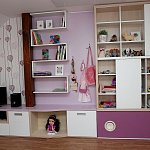 Při návrhu jsem vycházela z konceptu sousedního bratrova pokoje – Barunčin pokoj měl být jeho holčičím protějškem. A tak v něm najdete stejně jako u bratra knihovnu „hada“, komody – lavice, stůl s deskou do oblouku a velkou skříň na oblečení. Dekor dřeva, stejně jako u bratra, zastupuje bříza a původní buková postel. Barevná kombinace lamina ve fialové a bílé je doplněna tapetou s růžovofialovým květinovým vzorem.
