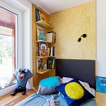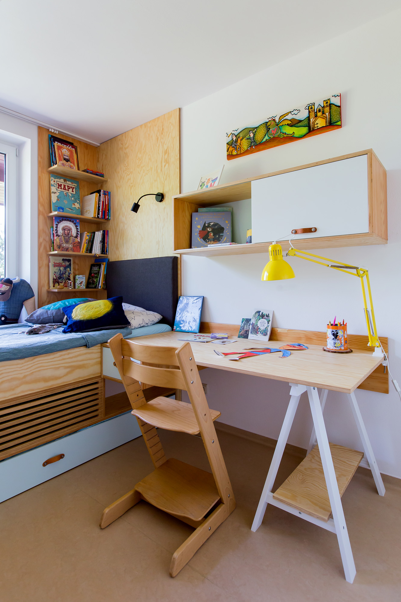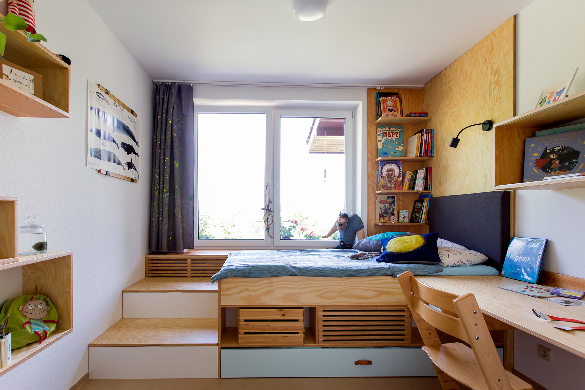 K vysokému lůžku se Dan dostane po schůdkách, které jsou úložné. Jelikož je pod oknem radiátor, počítali jsme i s jeho odvětráním v rámci lůžka. Zručný truhlář nakonec vyměnil i celý, původně plastový parapet. Nyní je na něm vidět mistrovská řemeslná práce. Chlapec má nad lůžkem poličky na knížky, kterých je v rodině nepočítaně, a jsou to samé speciální kousky. Aby se lůžko pro kamaráda mohlo vysouvat, stojí psací stůl jen na jedné noze/ koze a na druhé straně je kotven k lůžku.