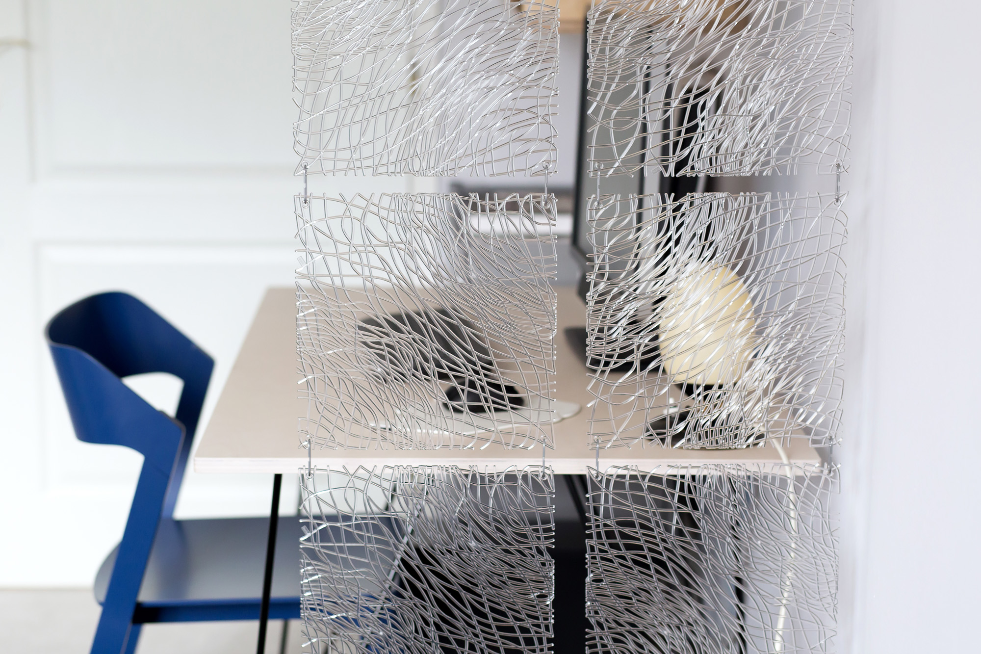 Pracovně vévodí psací stůl, který je nakonec po všech peripetiích a zvažování všelikerých variant komplet od Master@Master. Nohy a překližkové stolové desky této party nás nadchly na podzimním Meat Designu v Ostravě a mně bylo jasné, že přesně tohle potřebuje jedna zarytá blanenská milovnice českého designu. Zavěšené skříňky z lamina opatřené vtipnými úchytkami z Fleru doplňují dvě otevřené překližkové police. Vedle stolu stojí plechová skříňka z Ikea. A abychom si trochu usmířily energii čchi, oddělily jsme pracovní koutek od spaní dělicími čtverci od Koziolu. Na nich se doslova magicky láme světlo zapadajícího slunce a vytváří neskutečné stíny na stěnách.