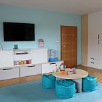 Naproti lůžku je úložná sestava na hračky, hry, dětské drobnosti a knížky. Police knihovny zatím zdobí sbírka plyšáků. Později budou nahrazeni knížkami. Věřím, že Kristýnka bude vášnivou čtenářkou stejně jako rodiče. Televize je možná trochu kontroverzním doplňkem dětského pokoje, ale od počátku se s ní počítalo. Rodiče samozřejmě vybírají program a pokoj může sloužit i jako útočiště člena rodiny, který se bude chtít na pár chvil trochu izolovat.