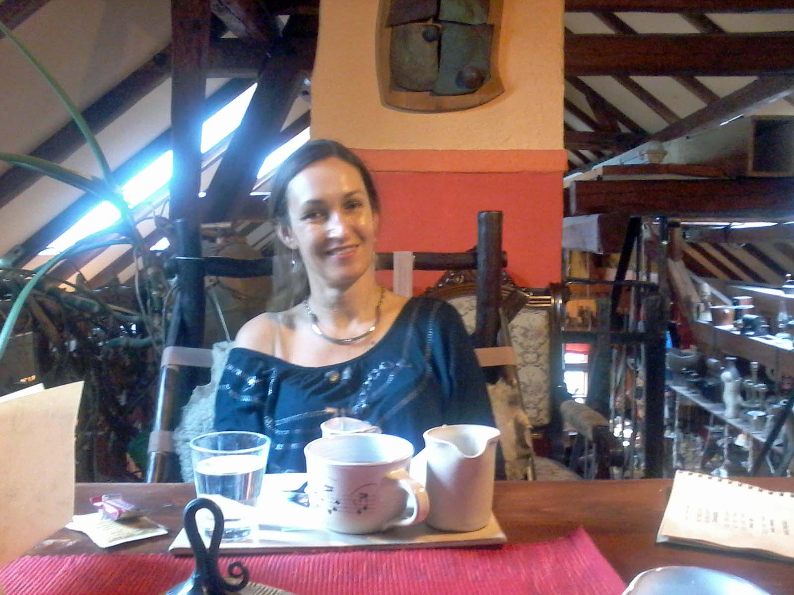 Zahájily jsme v kavárně Do mlejna v nedalekém Markvarci. Je tradičním cílem našich cyklovýletů, když jsme v Kanadě na kole. Mají tam neodolatelnou horkou čokoládu a na mlýnku dobrou kávu. Fotila jsem svým mobilem s mizerným rozlišením a třesoucí se rukou, ale Evička se spokojeně směje, tak by byla škoda se nepodělit.
